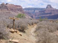 As anticipated, Horn Creek was dry as well. In any case, its waters are contaminated with a natural uranium source and its consumption is not recommended either. The existence of water is however patent due to the growth of trees and plenty of bushes in the area. This made Horn Creek a plausible spot for a lunch break that we gladly appreciated. After setting out again on our path to Indian Garden, we encountered our first rattlesnake of the trip. Elisabeth was leading the way at that moment and upon stepping on the path close to a big bush, we heard the rattle repeatedly. None of us had heard that sound previously but on TV, so we tried to be careful and bypassed the snake without bothering it too much. Later we confirmed our hypothesis that we would find snakes close to any water source, since water meant food for mice and mice are food for snakes. In fact, every time we found a watery spot in the dryness of the desert, the fauna around it was plentiful if not always visible.