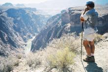 At 8am we left camp to traverse the last miles of Grapevine creek, onto the main Tonto plateau again. It was a relatively painless walk except for the initial sections of the trail that were narrow ledges of sandy terrain over very deep cliffs. Carrying a heavy backpack, it is difficult to navigate through these ledges especially when you find rocks protruding from the walls on the Canyon side that bump against the backpack.