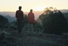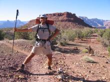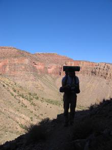 Once we reached the trailhead that descended into Hance, we saw the difficulty of this approach. The path is very narrow and crumbly with rocks and sand. We tried to keep an eye on possible traces of water to locate Page spring. After descending maybe 50m, we reached a small cave in the wall. Climbing down the path with our backpacks proved a very hard task and we reevaluated the situation.
